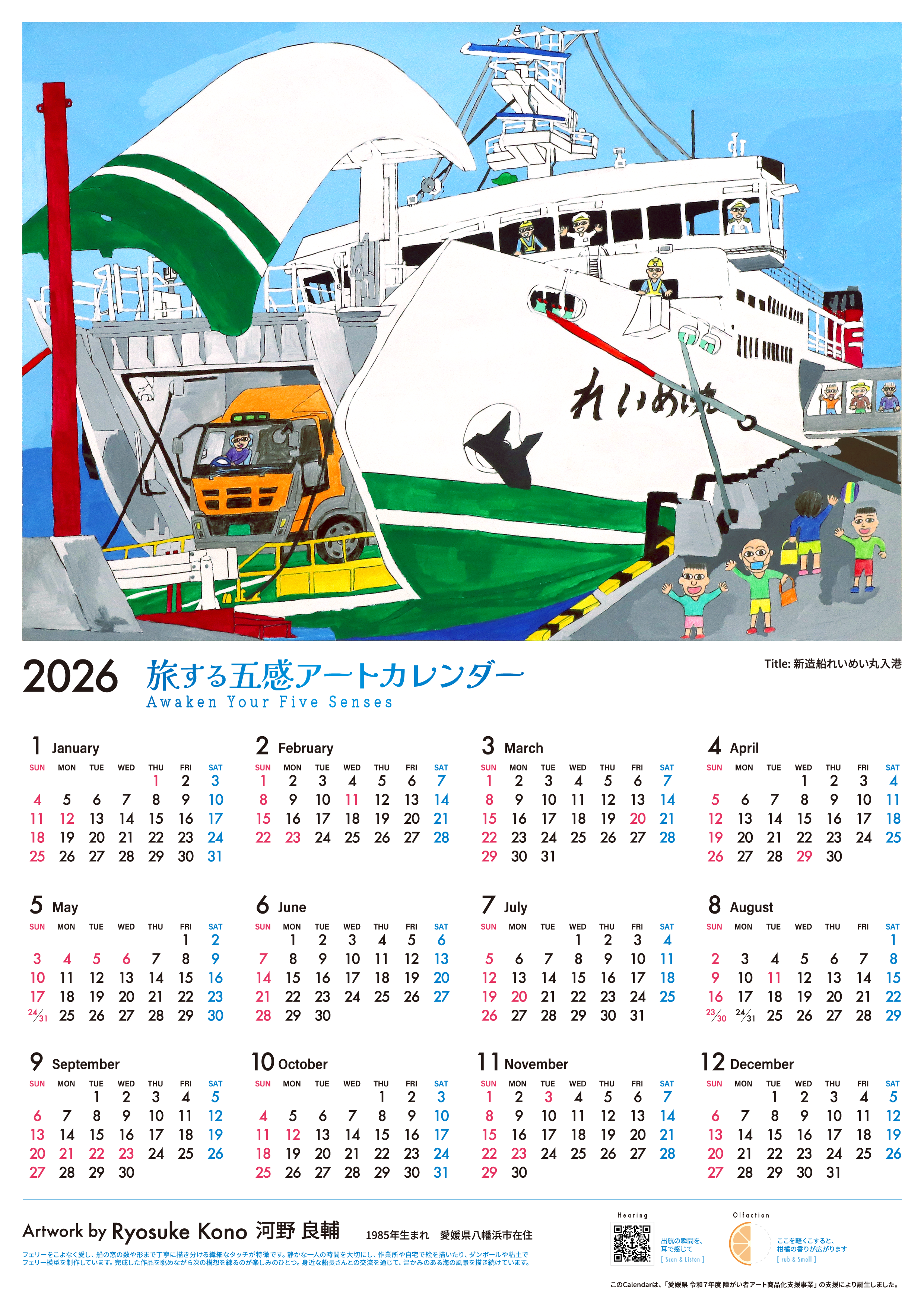 障がい者アーティスト 河野良輔/2026カレンダー「旅する五感アート」/新造船れいめい丸入港