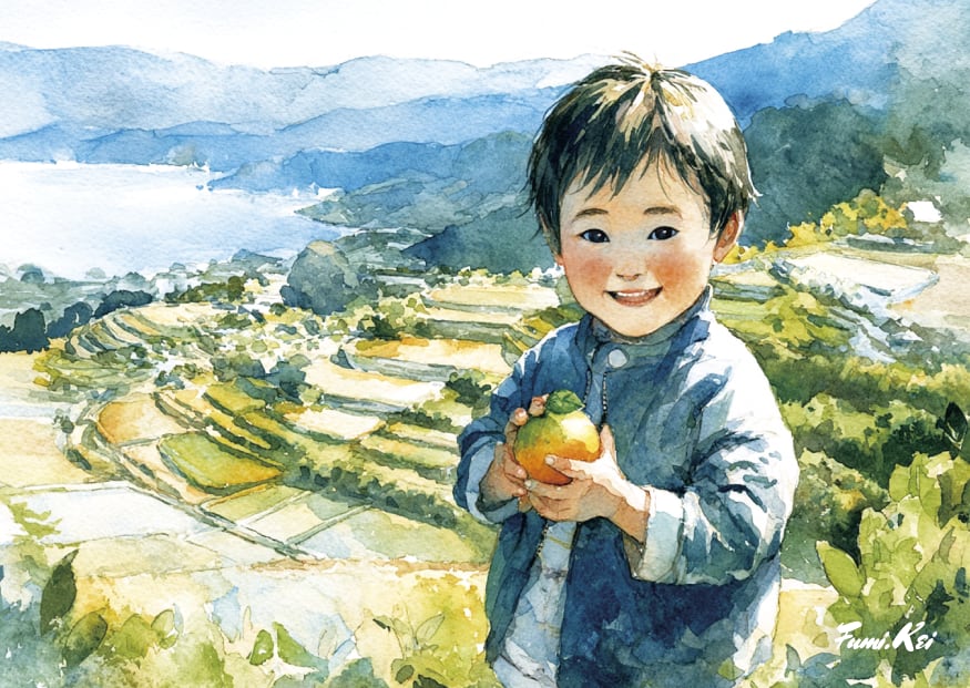 みかんと子どもたちをモチーフに、やさしい色合いと水彩のにじみで描かれた作品です。みかんの明るい橙色と、子どもたちのやわらかな表情。
