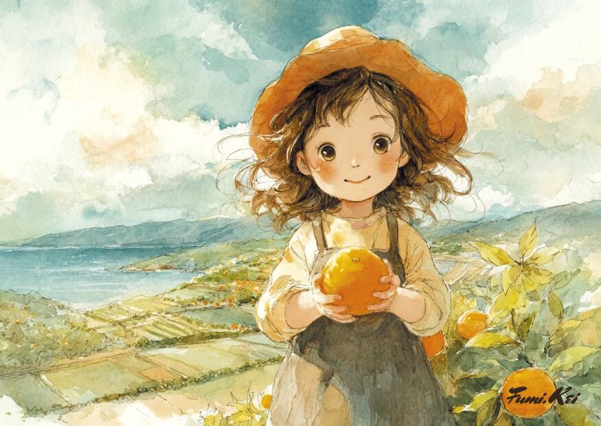 みかんと子どもたちをモチーフに、やさしい色合いと水彩のにじみで描かれた作品です。みかんの明るい橙色と、子どもたちのやわらかな表情。