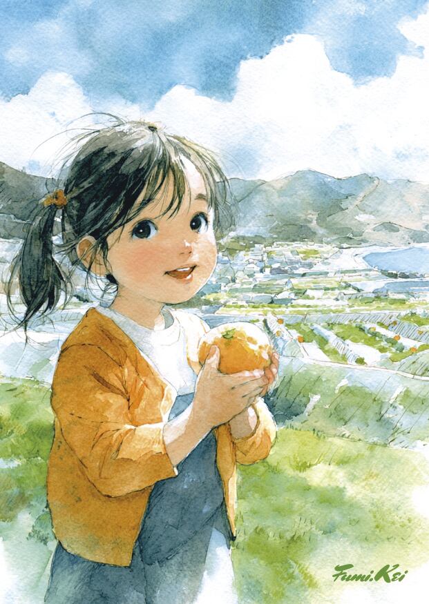 みかんと子どもたちをモチーフに、やさしい色合いと水彩のにじみで描かれた作品です。みかんの明るい橙色と、子どもたちのやわらかな表情。
