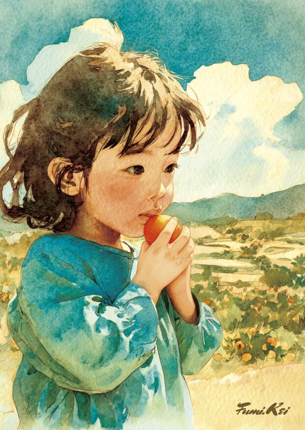 みかんと子どもたちをモチーフに、やさしい色合いと水彩のにじみで描かれた作品です。みかんの明るい橙色と、子どもたちのやわらかな表情。