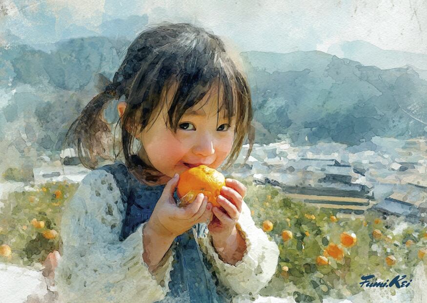 みかんと子どもたちをモチーフに、やさしい色合いと水彩のにじみで描かれた作品です。みかんの明るい橙色と、子どもたちのやわらかな表情。