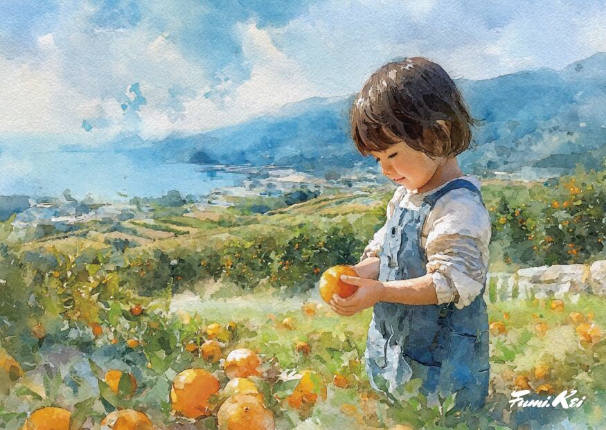 みかんと子どもたちをモチーフに、やさしい色合いと水彩のにじみで描かれた作品です。みかんの明るい橙色と、子どもたちのやわらかな表情。