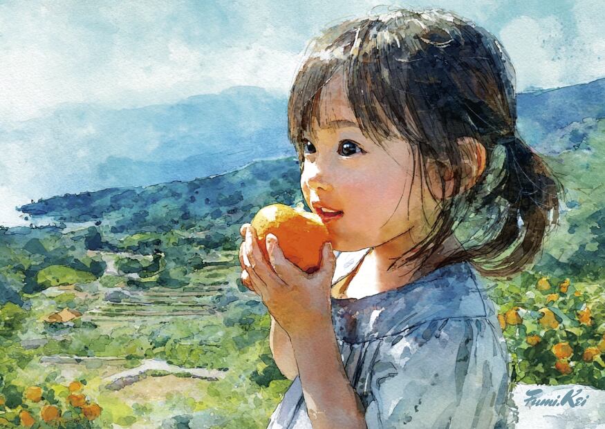 みかんと子どもたちをモチーフに、やさしい色合いと水彩のにじみで描かれた作品です。みかんの明るい橙色と、子どもたちのやわらかな表情。