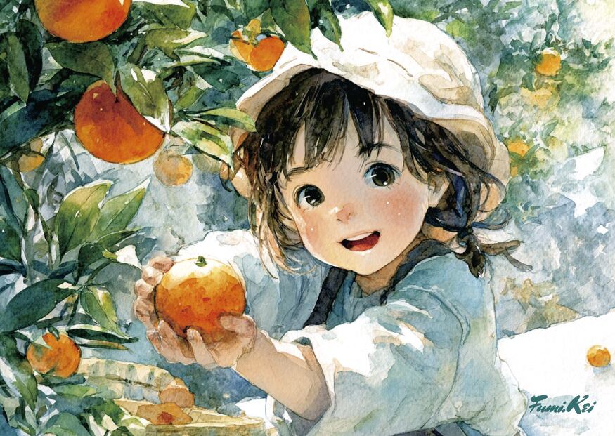 みかんと子どもたちをモチーフに、やさしい色合いと水彩のにじみで描かれた作品です。みかんの明るい橙色と、子どもたちのやわらかな表情。