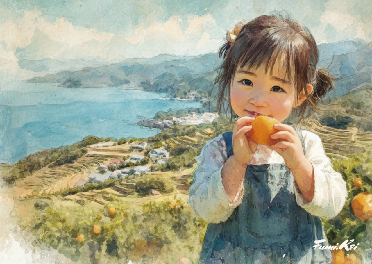 みかんと子どもたちをモチーフに、やさしい色合いと水彩のにじみで描かれた作品です。みかんの明るい橙色と、子どもたちのやわらかな表情。
